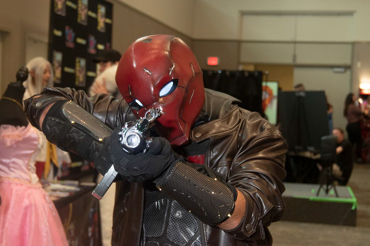 A celebrity cosplayer and costume contest judge playing as the Red Hood, during the 2023 Ottawa show.