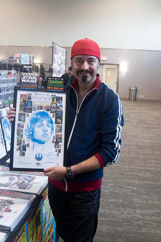 Kurt Lehner, shown here displaying one of his Star Wars prints, has been a vendor at the show since the inaugural edition.