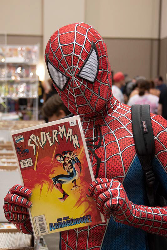 A Spiderman cosplayer shopping for Spiderman comics. From 2022.