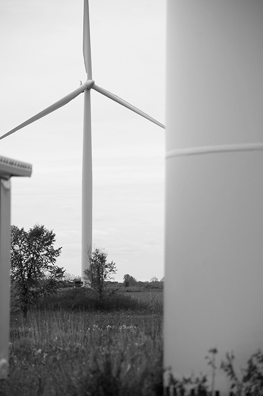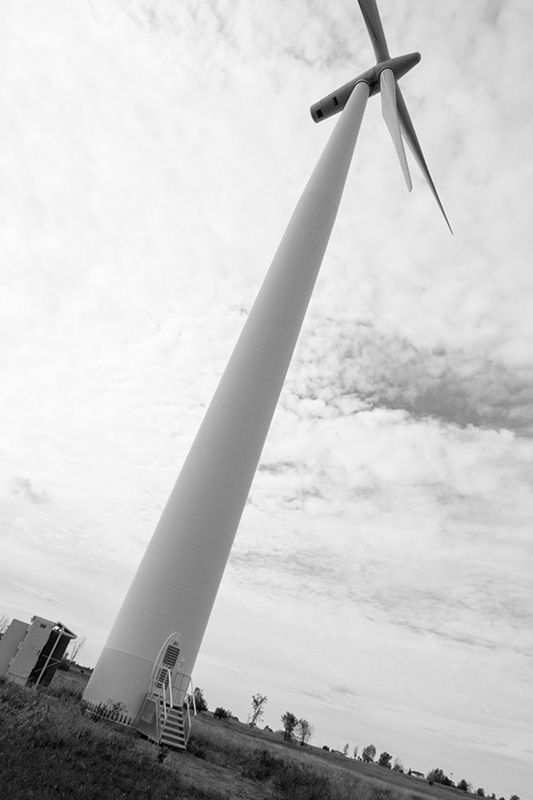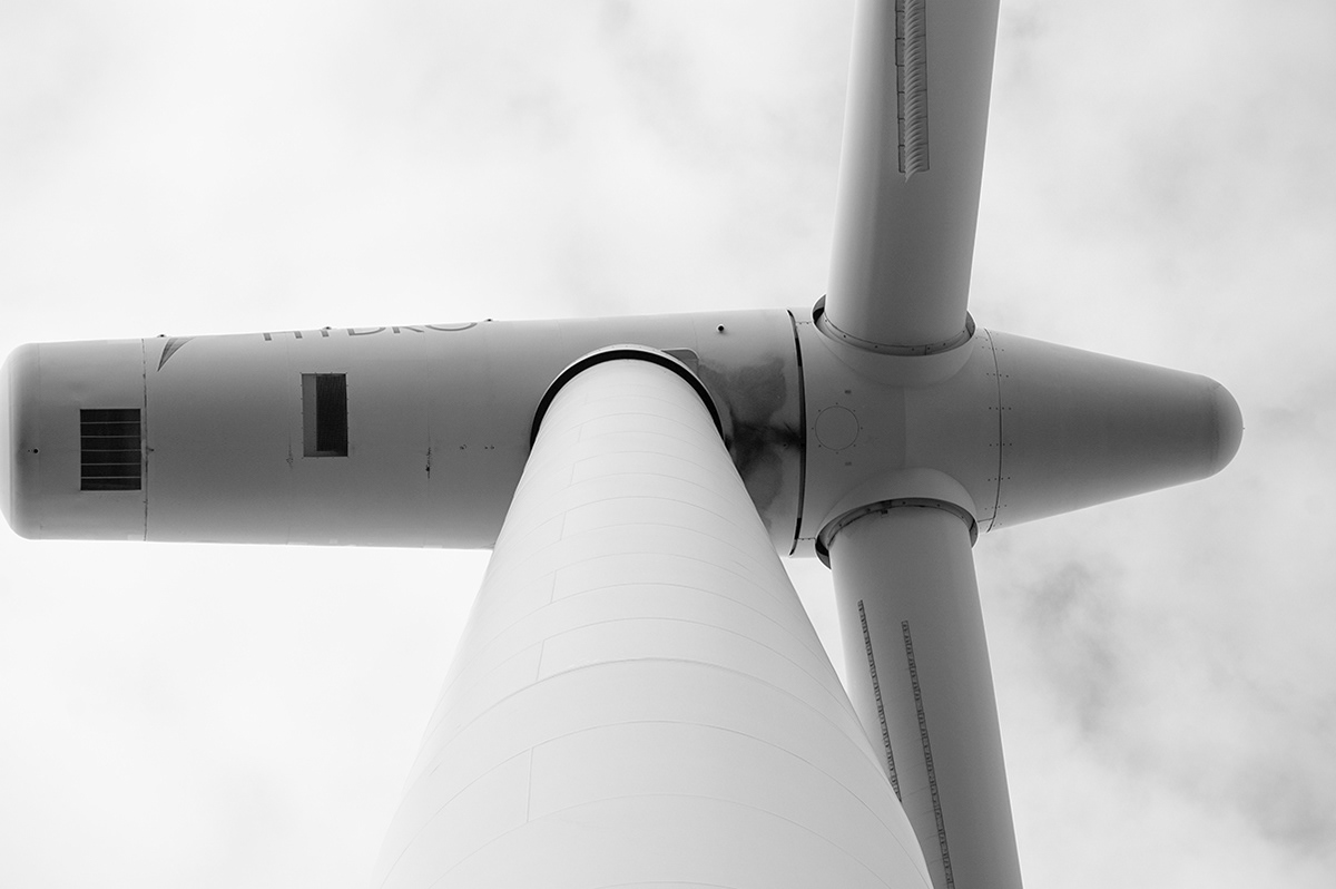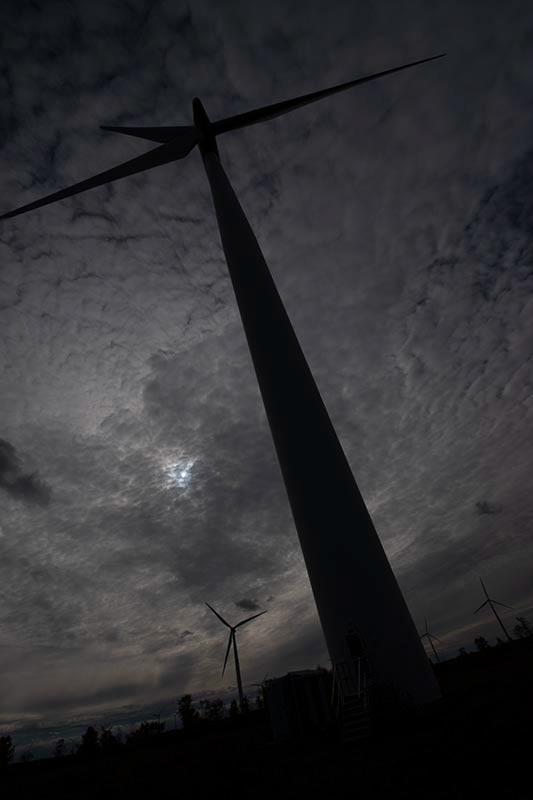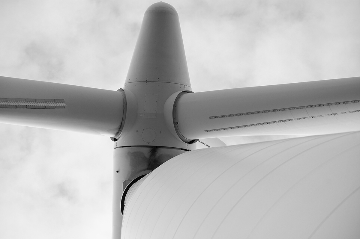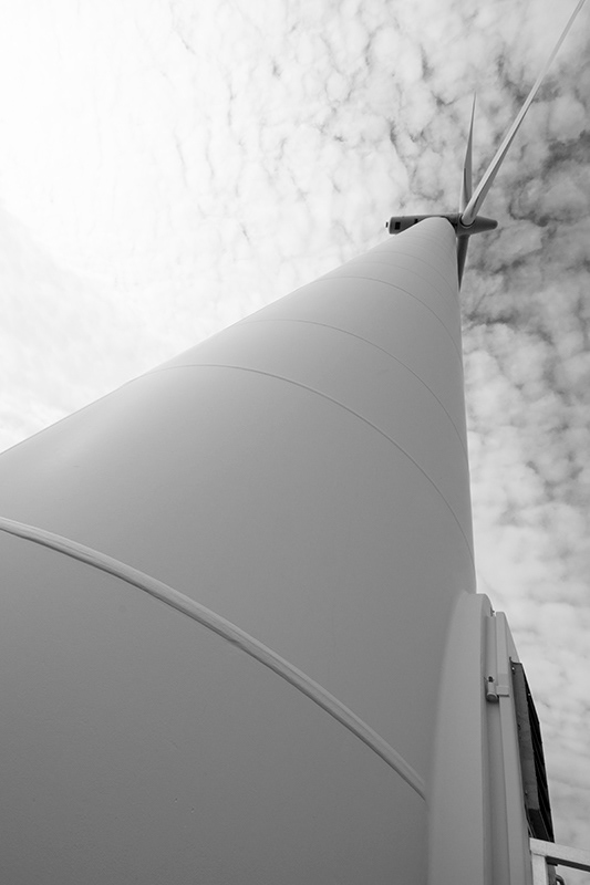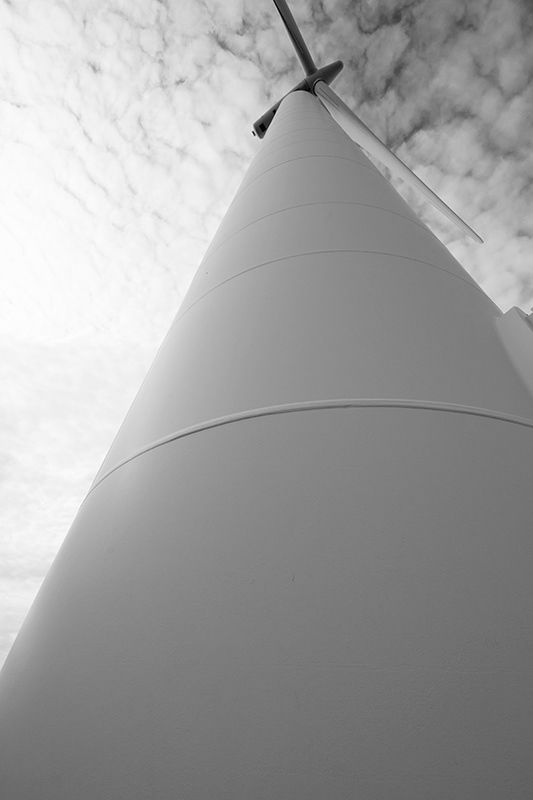 From the base of the windmill, looking straight up as the blades rotate above us.