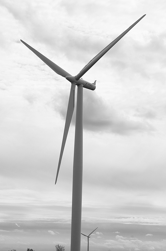 On a cloudy day, a windmill is busy producing wind-powered electricity.